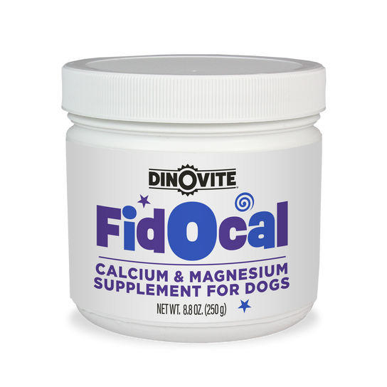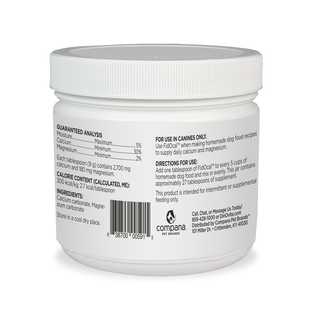 Use FidOcal™ when making homemade dog food recipes to supply daily calcium and magnesium. Add one tablespoon of FidOcal™ to every 5 cups of homemade dog food and mix in evenly. This jar contains approximately 27 tablespoons of supplement.