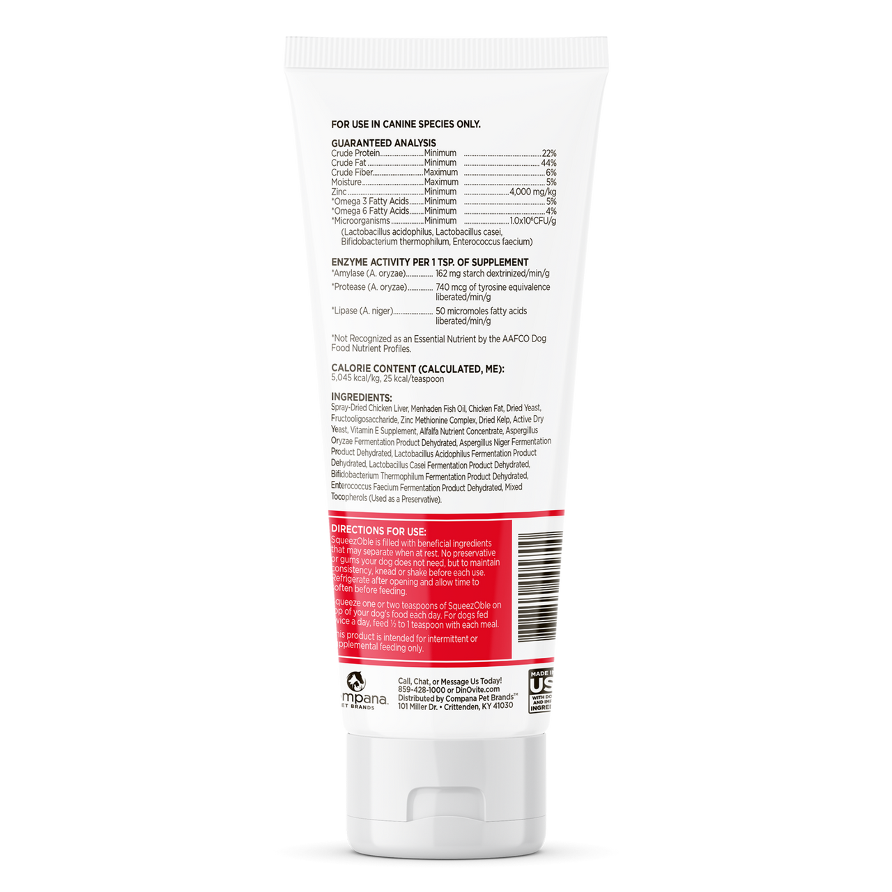 SqueezeOble for Dogs packs probiotics, prebiotics, omega fatty acids, and other nutrients in an easy-to-feed formula to support a healthy gut, healthy skin & coat, and overall immune support. In fact, Dinovite has helped over a million pets already! Just squeeze a little on your dog's food daily, and in a few short weeks, prepare to reunite with a healthier, all-around happier pet, guaranteed.