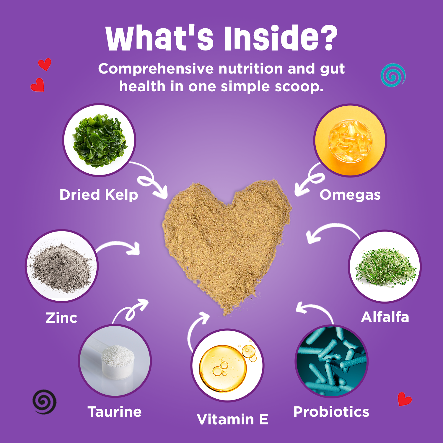 Picky Eater Tip: For finicky cats, start by sprinkling the 1/4 scoop of Dinovite at the bottom of your cat's bowl, then add your cat's food on top and do not mix. Let your cat eat their food down to the Dinovite supplement for 1-2 weeks. When your cat is accustomed to the new smell and taste and starts eating it, then begin mixing Dinovite power into their food. Adding something irresistible on top like Lickochops or their favorite treats can also help entice picky eaters.