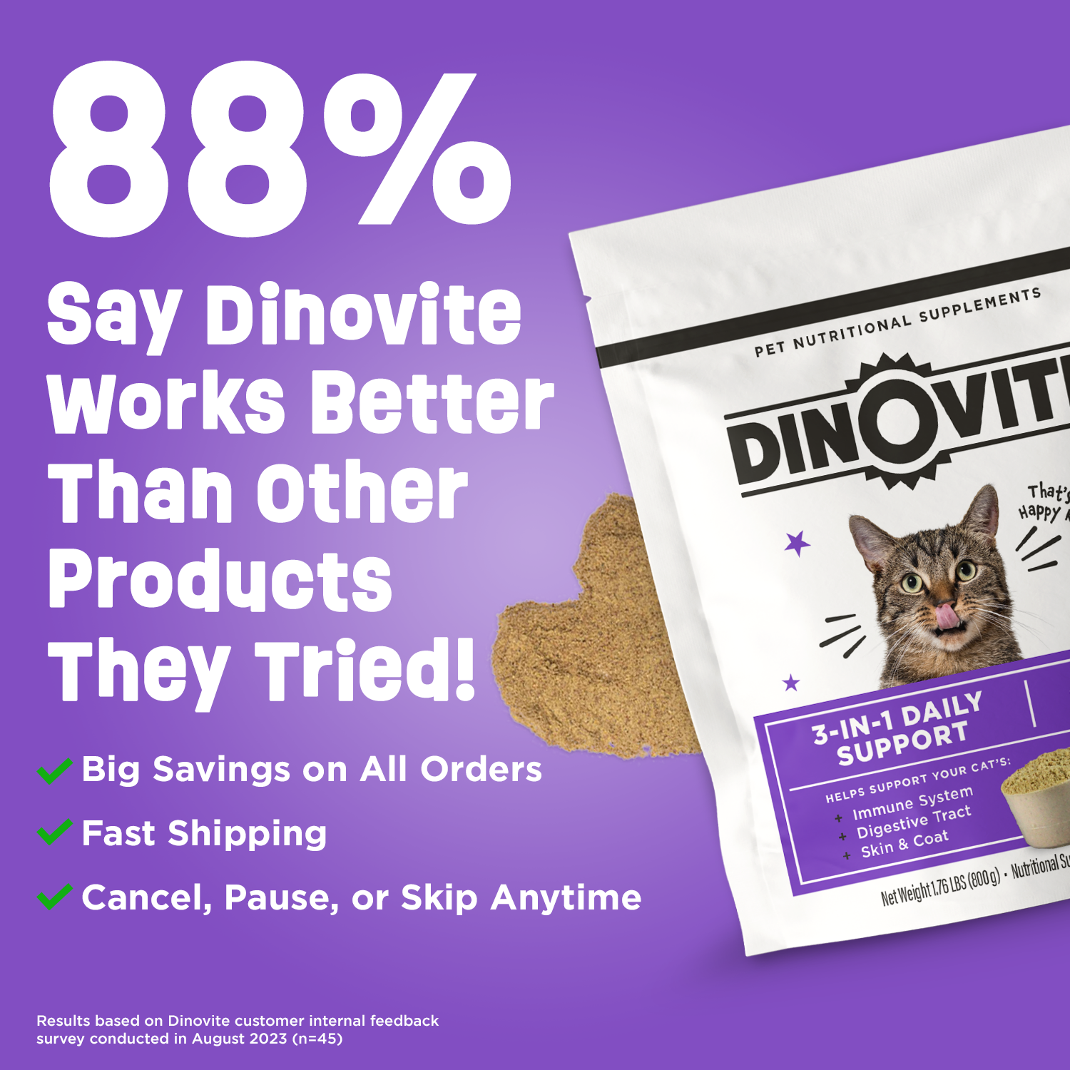 Add Dinovite powder to your cat's food every day and prepare to reunite with a healthier, all-around happier kitty, guaranteed! Seriously, 90 days or your money back.